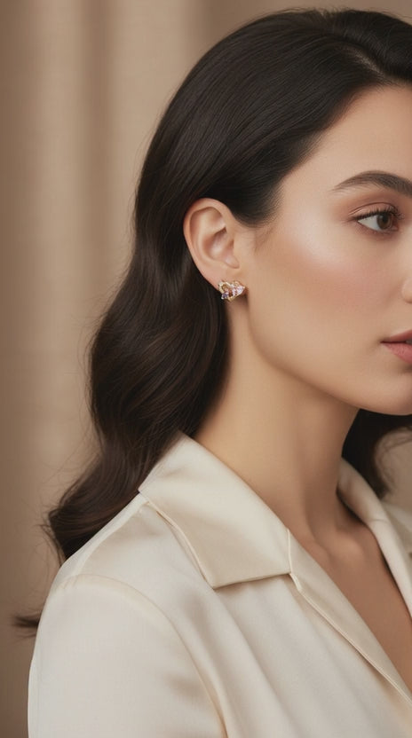Delicate gold heart-shaped earrings adorned with sparkling pink and purple gemstones. These elegant studs add a touch of romance and sophistication to any outfit.