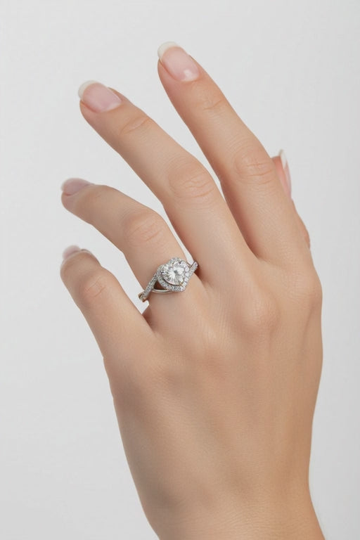 Elegant heart-shaped zircon ring with a stunning halo setting and twisted infinity band. Features sparkling cubic zirconia stones set in premium white gold-plated metal. Adjustable design ensures a perfect fit for any finger size. Perfect for everyday elegance or special occasions.